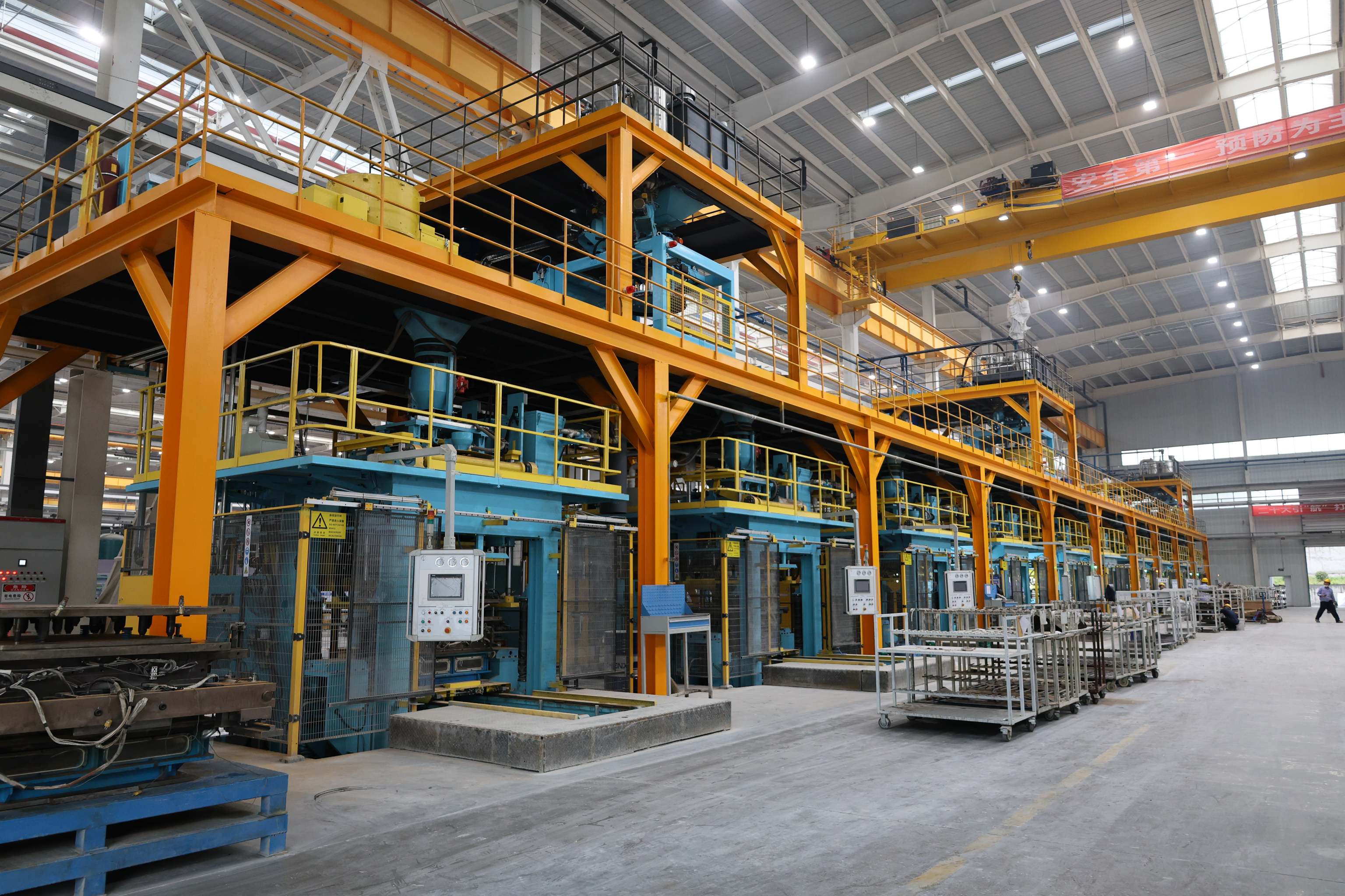 整個生產過程采用信息化追溯管理系統,產品通過二維碼對全過程進行信息跟蹤并記錄。同時還擁有多條各類自動化生產線(如澆注自動化生產線、后處理自動化生產線、總裝自動化生產線等)。其中澆注線具備自動澆注、取件、打碼功能;后處理線可進行自動化冷卻、振砂、切邊切澆冒口等作業;探傷(ADR)具備自動識別鑄件缺陷功能,提升了檢測效率。
